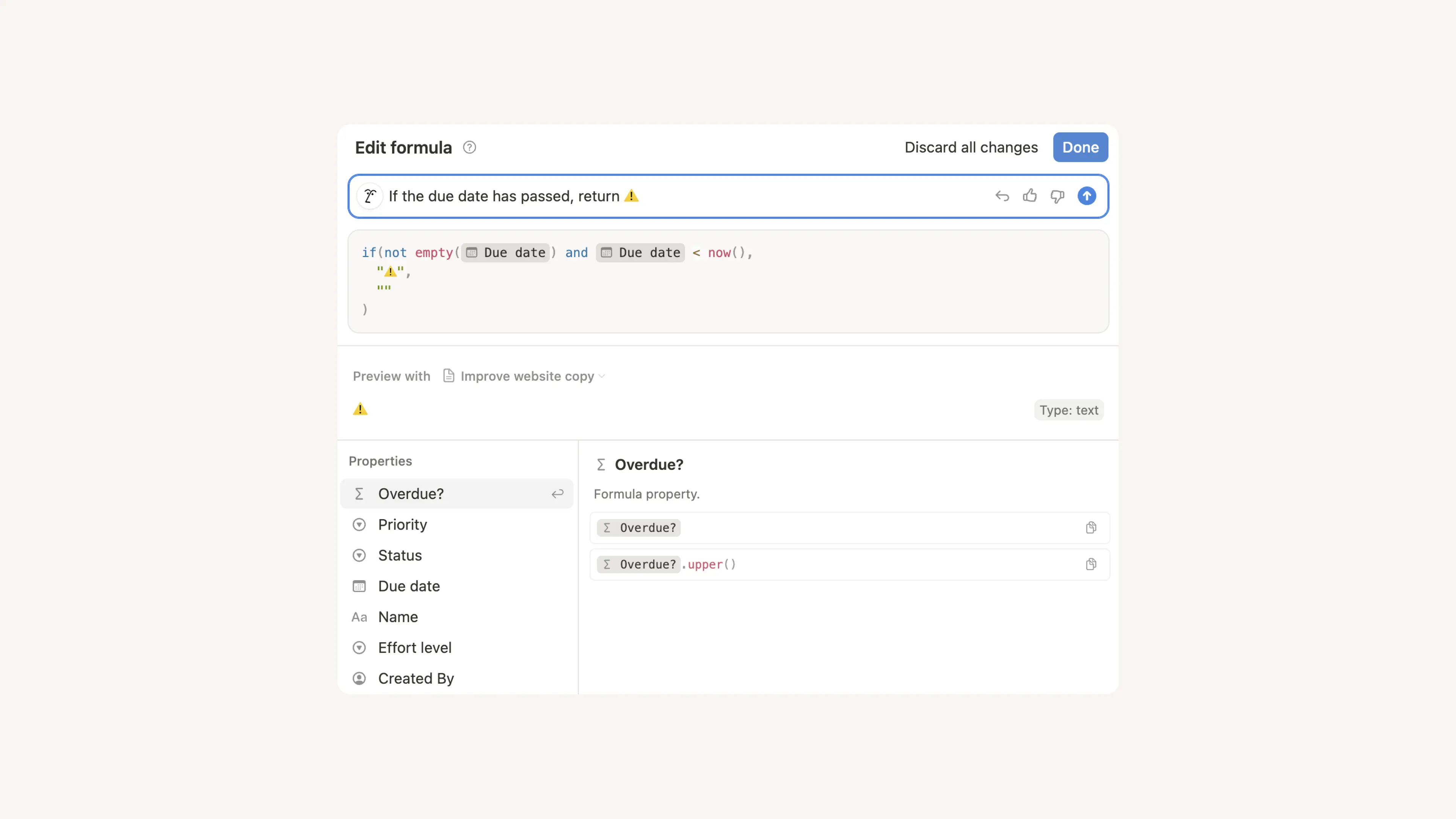 「この数式でエッジケースを処理して」(たとえば、Notion AIは、フィールドが空欄の場合に数式がエラーとならないようにif文を追加できます。)