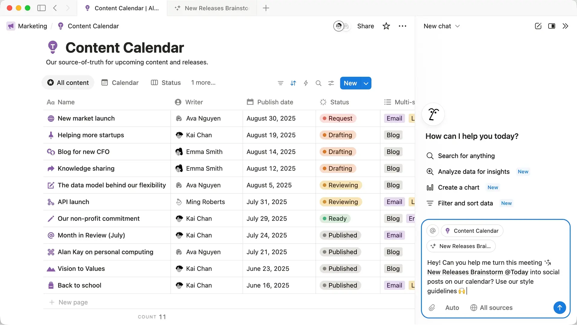 ミーティングのメモブロックを使用して新しいミーティングのメモページを作成し、プロジェクトチャンネルで進行中の最新プロジェクトと未解決の議論に基づいて、短い議題を追加します。